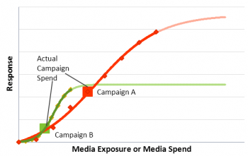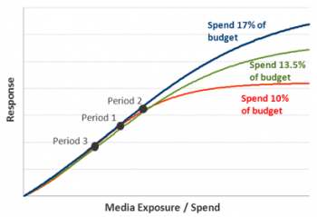 Second, the response curves enables to see the impact of flighting on the overall media effect. In other words, such response curves help to assess how different flighting can result in a different response. Even more importantly, they also provide guidelines how to optimally plan media at different budget constraints. (See Case Study and accompanying two figures below).