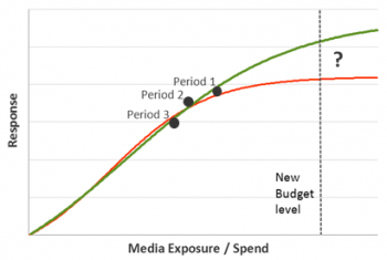 First, if only a small range of spend levels were tested in the past, there is uncertainty, what the effect will be if the actual spend largely differs from the tested levels. This scenario is illustrated in chart above.